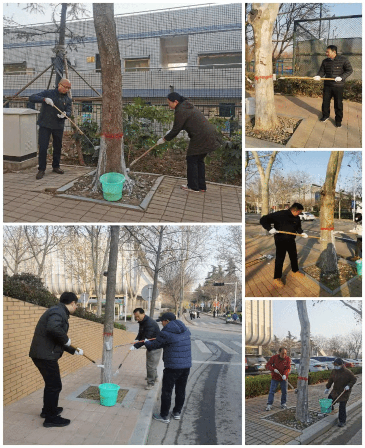 活动现场,初冬的寒风虽带着凉意,但后勤同志们的热情丝毫未减。大家以小组为单位分工协作:有的仔细搅拌防护涂料,确保浓度均匀;有的手持毛刷,蹲在树旁认真刷涂树干底部,确保每一寸树皮都被均匀覆盖;有的则来回巡查,及时补涂遗漏的角落。
