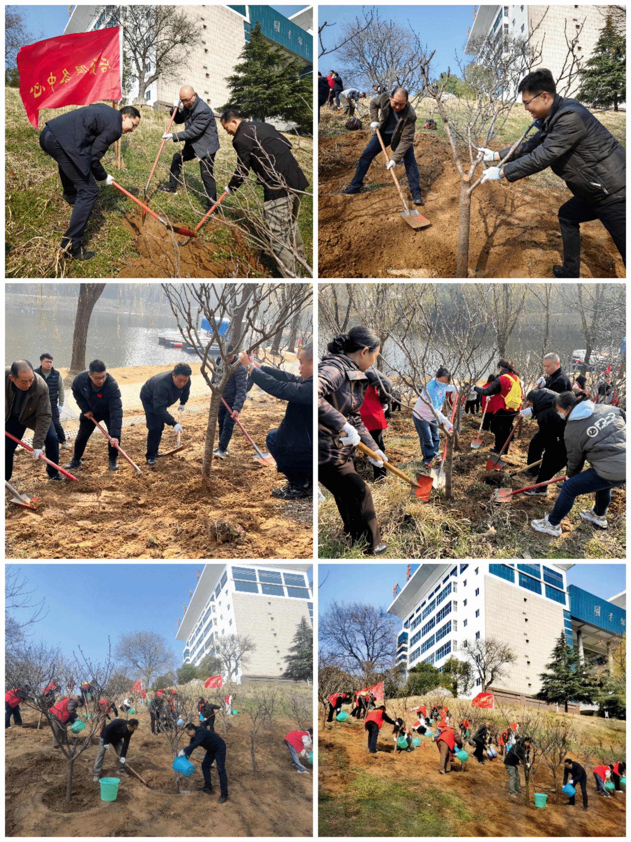 经过一个多小时的辛勤劳作,30余株新栽的樱花树苗错落有致地挺立在码头沿岸,迎风而立,为初春的校园注入了盎然生机。
